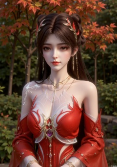 including a headpiece with red leaves and dangling chains. The character is dressed in an elaborate red and white outfit with intricate designs