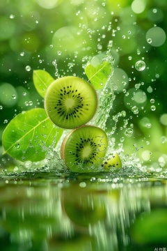 E-commerce Poster,The image depicts a vibrant and dynamic scene of a kiwi fruit in the foreground. The kiwi is sliced into two pieces,with one piece,prominently displayed against the backdrop of water droplets that appear to be splashing. The fruit is surrounded by green leaves,suggesting a natural,outdoor setting. The lighting is bright and natural,with sunlight creating a bokeh effect in the background,adding a sense of depth and highlighting the freshness of the fruit. The overall composition is visually striking,capturing the essence of a refreshing,nature-inspired moment.