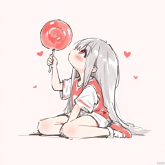 A cartoon girl with long gray hair, dressed in red and white clothes, sitting cross legged on the ground. Her eyes were bright, her cheeks flushed, and she held a huge lollipop in her hand. The girl looked up at the lollipop, her eyes full of love, and the two heart symbols next to her added a sweet and warm atmosphere to the picture.