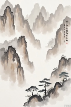 The image depicts a serene and majestic landscape featuring towering, rugged mountains shrouded in mist, creating a sense of depth and mystery. The mountains are painted in varying shades of brown and gray, with some areas highlighted by lighter tones to suggest the fog or clouds enveloping them. In the foreground, there are several pine trees with distinct, rounded canopies, their dark green needles contrasting with the muted background. The overall composition is reminiscent of traditional East Asian ink wash painting, characterized by its emphasis on natural forms and atmospheric effects. The text in the image is in Chinese characters, which are placed on the right side of the painting. The characters are written in a traditional calligraphic style, adding to the cultural authenticity of the artwork.,YT ink brush strokes