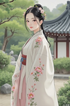 The image depicts a woman dressed in traditional East Asian attire, specifically a flowing robe adorned with intricate floral embroidery. She is standing outdoors, surrounded by lush greenery, including trees and shrubs. The background features a traditional architectural structure with a curved roof, suggesting a garden or historical site. The woman's hair is styled elegantly, adorned with decorative hairpins and flowers, complementing her traditional outfit. The overall scene exudes a serene and classical atmosphere.,YT ink