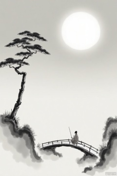 The image depicts a serene and minimalist scene with a large full moon in the upper right corner, casting a soft glow over the landscape. A solitary figure, dressed in traditional attire, sits on a curved bamboo bridge, holding a staff. To the left of the figure, a gnarled tree with dense, textured foliage stands tall, its branches extending outward. The background is a gradient of light gray, giving a sense of depth and tranquility. The overall composition is balanced, with the figure and the tree creating a focal point, while the moon and the bridge add a sense of calm and contemplation. The image is rendered in a traditional East Asian ink wash painting style, characterized by its use of monochromatic tones and fluid brushstrokes.