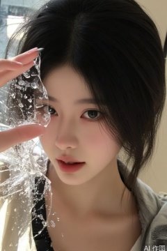 1girl, mixed-media collage portrait, left half realistic DSLR photograph with visible pores, right half anime cel-shading with bold black outlines, split lighting (studio softbox vs comic book halftone shadows), hand reaching out shattering glass-like dimensional barrier .