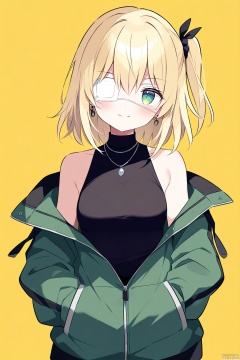1girl,eyepatch,solo,yellow background,jewelry,medical eyepatch,jacket,hands in pockets,simple background,medium hair,blonde hair,green eyes,piercing,shirt,green jacket,ear piercing,necklace,sleeveless,earrings,closed mouth,upper body,looking at viewer,smile,off shoulder,black shirt,hair between eyes,bare shoulders,breasts,hood,sleeveless shirt,