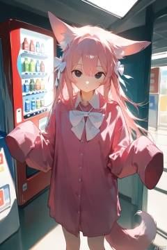 masterpiece, best quality, doremifaso64, 1girl, solo, looking at viewer, shirt, long sleeves, bow, animal ears, standing, tail, pink hair, indoors, bowtie, black eyes, sleeves past wrists, feet out of frame, white bow, sleeves past fingers, pink shirt, oversized clothes, vending machine,sketch,