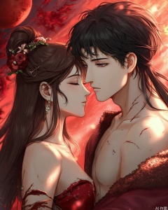 (Masterpiece,. Best picture quality, movie picture),glow style, 1girl, 1boy, hair ornament, flower, brown hair, hair flower, black hair, hair rings, long hair, jewelry, closed eyes, topless male, injury, ponytail, earrings, chinese clothes, blood, parted lips, hetero