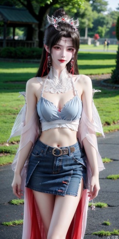 1girl,kind smile, bare_shoulders, belt, blurry, blurry_background, blurry_foreground, branch, , , collarbone, cosplay_photo, denim, denim_skirt, depth_of_field, hand_on_own_chest, lips, , looking_at_viewer, midriff, miniskirt, motion_blur, navel, outdoors, photo_\(medium\), realistic, skirt, solo, standing, tree,liumei