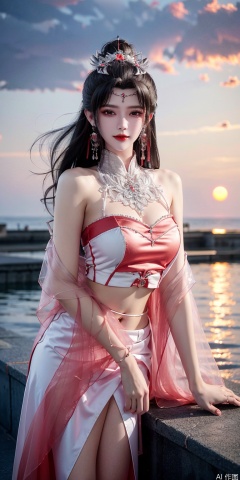 1girl, solo, long hair, , looking at viewer, skirt, hair ornament, bare shoulders, jewelry, , black hair, earrings, outdoors, midriff, water, necklace, lips, crop top, grey eyes, leaning forward, ocean, white skirt, strapless vest, sunset, sun,liumei