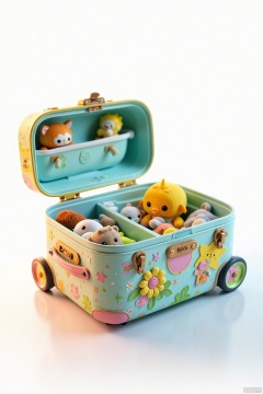 Close-up shot of a colorful children's travel trunk with intricate carvings and vibrant patterns on its lid, set against a bright white background. Soft, warm lighting highlights the textured surface, while a subtle focus effect draws attention to the cleverly designed compartments and handles. A few stuffed animals peek out from within, inviting the viewer to explore the contents.