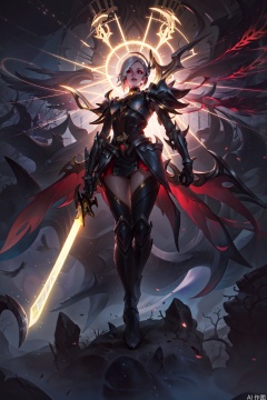solo, 1girl, holding, full body, weapon, male focus, wings, sword, holding weapon, armor, glowing, halo, holding sword, night background, shoulder armor, gauntlets, spikes, pauldrons, full armor, multiple wings,multiple eyes on wings,Old God
