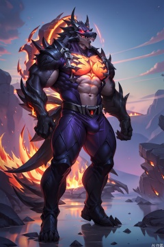 solo, looking at viewer, 1boy, standing, tail, full body, male focus, thighs, teeth, artist name, bodysuit, muscular, glowing, thick thighs, abs, fire, pectorals, sharp teeth, muscular male, bara, glowing eyes, spikes, large pectorals, bulge, flaccid, molten rock,Old God
