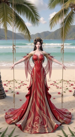 SFW,(masterpiece:1.2),best quality,absurdres,masterpiece,original,extremely detailed wallpaper,perfect lighting,Golden sandy beach covered with vibrant flowers, turquoise waves gently lapping the shore,red long dress ,elegant woman in embroidered qipao swinging on a wooden swing under coconut trees, bright flower clusters spreading from sand to palm tree roots, soft natural light filtering through coconut leaves, ocean breeze lifting hair and qipao hem, high-resolution details showcasing petal textures and silk fabric sheen, ultra-wide angle lens capturing coastline panorama, cinematic color grading with soft focus on the central figure,(huge breasts:2.99),(full breasts:2.99),Xzhihua,Xsiyouyou,Xyanruyu,Xmoxiaonan,Xyeqingxian