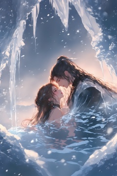 renzu,The image depicts a romantic and serene scene where two individuals are immersed in a body of water, surrounded by an enchanting wintery environment. The setting is characterized by the presence of icicles hanging from above, creating a magical and ethereal atmosphere. The water appears to be clear and calm, reflecting the soft light that illuminates the scene. The individuals are dressed in attire that suggests a fantasy or mythical theme, with intricate details and flowing fabrics. The overall mood of the image is one of intimacy and tranquility, capturing a moment of connection between the two characters amidst the beauty of the winter landscape.