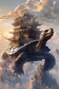 yishou,The image depicts a fantastical scene where a large turtle,known as a tortoise,is carrying an intricate,multi-tiered Chinese-style building on its back. The building is adorned with ornate details and golden accents,and it appears to be floating above a misty,mountainous landscape. The sky is filled with soft,warm hues of sunset,and birds can be seen flying in the distance,adding to the surreal and dreamlike atmosphere of the scene.,