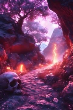 mojie,The image depicts a mystical forest scene with a winding stone path leading into the distance. The atmosphere is ethereal,with glowing particles floating in the air and soft,pinkish light illuminating the scene. On the left side of the path,there is a prominent glowing skull,which appears to be emitting a warm,orange light. The surrounding area is filled with rocks,trees,and vibrant flowers,creating a surreal and enchanting environment. The overall mood is mysterious and magical,inviting the viewer to explore further into the enchanted forest.,