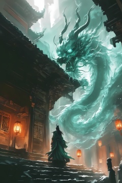 yishou,The image depicts a mystical scene set in a traditional East Asian architectural environment,likely a temple or palace. The atmosphere is ethereal,with a glowing blue dragon emerging from the shadows,its body intricately detailed and swirling with energy. The dragon's presence is both awe-inspiring and serene,as it seems to be in a state of calm power.,In the foreground,a figure dressed in flowing,dark green robes stands on a set of stone steps,gazing up at the dragon. The figure's posture suggests reverence or contemplation,adding to the mystical ambiance of the scene. The surrounding architecture features wooden beams,ornate windows,and hanging lanterns,which are softly illuminated,casting a warm glow against the cool blue tones of the dragon.,The overall mood of the image is one of wonder and tranquility,blending elements of fantasy and cultural heritage.,