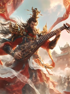 shenzu,The image depicts a majestic figure,adorned in elaborate traditional armor,playing a large,intricately designed string instrument. The character's attire is rich with ornate details,including a crown-like headpiece and flowing robes. The background features a grand architectural structure,possibly a temple or palace,with a warm,golden light illuminating the scene. The overall atmosphere is one of grandeur and power,suggesting a historical or mythical setting.,