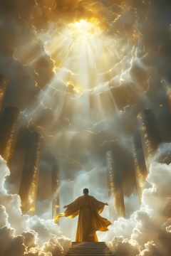 tiandiyixiang,The image depicts a dramatic and ethereal scene where a figure stands with arms outstretched, facing a radiant, golden light that streams through the sky. The figure appears to be wearing a robe and has wings, suggesting an angelic or divine presence. Surrounding the figure are towering, cylindrical structures that seem to be made of a glowing, molten material. The light beams create a sense of awe and reverence, casting a warm, golden hue over the entire scene. The overall atmosphere is one of grandeur and spiritual significance, with the figure seemingly in a moment of divine connection or revelation.