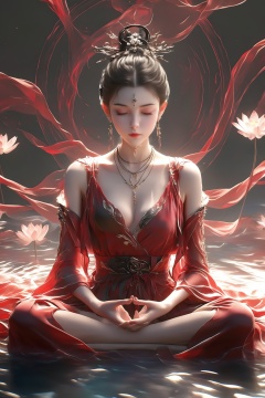 renzu,The image depicts a serene and ethereal scene of a woman seated in a meditative pose on a bed of lotus flowers. She is adorned in a flowing red gown with intricate gold and black detailing, which adds a touch of elegance and mystique to her appearance. Her hair is styled in an elaborate updo, crowned with an ornate headdress that features delicate, swirling designs. The background is dark, creating a stark contrast that highlights the soft, glowing light emanating from the woman's hands and the surrounding lotus flowers. The overall atmosphere is one of tranquility and spiritual enlightenment, with the woman appearing to be in deep meditation or contemplation.