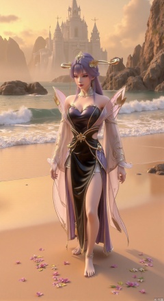 SFW,(masterpiece:1.2),best quality,3d anime style, cg,absurdres,masterpiece,original,extremely detailed wallpaper,perfect lighting,official art, A young woman in embroidered qipao standing barefoot on golden sandy beach, colorful flowers around feet, ocean waves washing over feet, white medieval castle with pointed towers resembling Neuschwanstein Castle perched on steep cliff in background, golden sunset rays piercing through clouds, ultra-wide angle composition with detailed foreground sand textures, dynamic mid-shot of figure interacting with waves, three-dimensional castle structure in background, high saturation colors, 8K resolution, precise depth of field control, HDR lighting, surreal elements blended with photorealistic details, realistic water reflections, intricate silk fabric texture, castle floating in mist atmosphere,(huge breasts:2.99),(full breasts:2.99),Xhenge,Xshisanyi