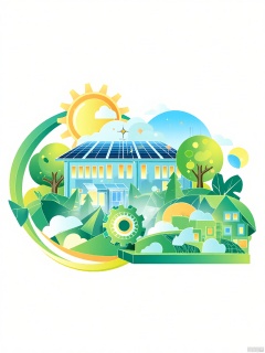 XSYY, Digital illustration of a futuristic, eco-friendly cityscape. Central building with solar panels on the roof, surrounded by greenery. Large, stylized gear in the foreground, symbolizing technology and innovation. Background features a gradient from green to blue, representing a sustainable environment. Sun and moon in the sky, with clouds and a tree. Geometric shapes and bright colors dominate the design. Clean, modern aesthetic.