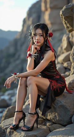 "Low-angle cinematic composition capturing a jeune fille in a statuesque seated pose atop a weathered boulder. Her slender frame leans into a gravity-defying 30-degree angle, left elbow propped on denim-clad knee while her chin rests in the cradle of her palm, eyes cast in a contemplative gaze that pierces the fourth wall. The opposing arm sweeps diagonally across her lap in a sculptural counterbalance. Dressed in a couture black cheongsam featuring scarlet silk brocade trim and hand-embroidered frog closures, she juxtaposes tradition with modernity through patent leather stilettos and freshwater pearl anklets that glimmer with each breath. A vermilion silk bow secures her ink-black tresses in a loose chignon, its trailing ribbons dancing in the breeze. The scene is bathed in golden-hour sidelight, with a crystalline sky providing ethereal contrast to the earthy textures of the rock formation. Special attention to the tactile details of her ensemble, the sinuous curve of her calves, and the sun-dappled serenity of the natural amphitheater."