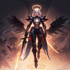 solo, 1girl, holding, full body, weapon, male focus, wings, sword, holding weapon, armor, glowing, halo, holding sword, night background, shoulder armor, gauntlets, spikes, pauldrons, full armor, multiple wings,multiple eyes on wings,monster girl,Old God
