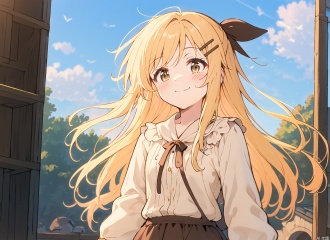 A kawaii girl, (YanQiaoke:1.1), yellow hair, Cream shirt, Brown skirt, brown hairclip, brown hair ornament,