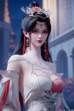 1girl, solo, long hair, black hair, hair ornament, dress, jewelry, closed mouth, upper body, earrings, hair bun, white dress, blurry, night, blurry background, expressionless