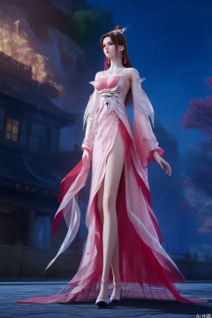 1girl, solo, long hair, brown hair, hair ornament, ribbon, jewelry, earrings, hair bun, dress, jewelry, full body, bare legs, night, pink dress, expressionless