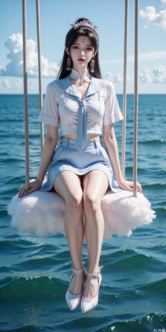 真人肌肤纹理, 4K画质,完美身材,long legs,Film texture, film and television, surrealism, a girl with a delicate face is sitting on a cloud swing. The girl is wearing a jk sailor uniform, a white short-sleeved shirt, light blue stripes trimming, a light blue tie, white blue pleated skirt, exquisite diamond-encrusted high heels, swing rope The sub is connected to a cloud in the sky, the background is a vast ocean, the water shows a consistent blue-green tone, the sky is also blue-green, blending with the ocean, perfect light and shadow, hyper-realistic photography, sharpening, artistic conception, Consciousness, large areas of blank space, sense of space, haziness, dreams, fog,liumei