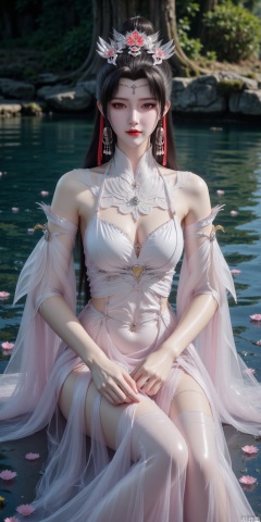 The image depicts a serene and ethereal scene with a female character sitting in a body of water. She has long, flowing  hair adorned with delicate flowers and golden ornaments, including a prominent headpiece resembling a crown. Her attire is a white, flowing gown embellished with intricate gold patterns and blue gemstones. The water around her is clear, with small bubbles and floating petals, creating a magical atmosphere. The background features a blurred natural setting with trees and rocks, enhancing the mystical and tranquil ambiance. The overall composition is highly detailed and visually captivating, with a focus on the character's peaceful expression and the enchanting surroundings.,liumei
