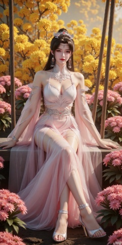The woman is depicted on a swing/ enveloped by an extravagant bloom of flora whose diaphanous white gown billows elegantly around her.