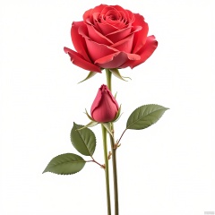 HYS, Photograph of two red roses, one fully bloomed and the other in the process of opening, against a plain white background. The roses have lush, velvety petals and green leaves with a slightly serrated edge. The stems are thin and slightly curved. The roses are centered in the frame, with the fully bloomed rose above the partially bloomed one. The lighting is soft and even, highlighting the natural beauty and texture of the flowers.