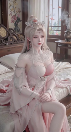(masterpiece, best quality:1.2),Ancient Chinese boudoir scene, long Hanfu dress ,sitting sideways on an intricately carved wooden bed, soft natural light filtering through sheer silk curtains, satin bedding with delicate sheen, detailed traditional Chinese Gongbi painting style, subtle celadon color palette, background featuring vintage dressing table and embroidered screen, falling plum blossom petals near window and wispy smoke from bronze incense burner, 8K resolution with intricate fabric draping and wood grain textures,,(huge breasts:2.99),(full breasts:2.99),XtianqiongY,XliumeiY