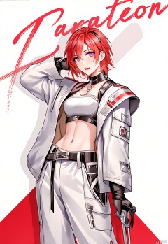 MTF, this is a game character portrait of a fierce warrior woman. She has short, spiky, crimson red hair and intense, piercing green eyes. She wears a suit of sleek, black armor adorned with silver accents, and carries a massive, glowing sword in her right hand. Her stance is powerful and confident, exuding strength and determination. The background is a simple white, enhancing the character's striking presence.