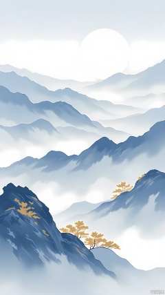 GFSS, A serene, digital painting of a misty mountain landscape at sunrise, featuring a large, glowing white sun in the background, casting a soft light over the rolling hills and valleys. The mountains are depicted in shades of blue and gray, with mist and fog adding a dreamy quality to the scene. Small, golden trees dot the landscape, adding a touch of warmth and contrast to the cooler tones. The overall mood is tranquil and ethereal, with a sense of peaceful solitude.