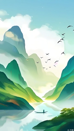 GFSS, A serene landscape painting in watercolor style, depicting a tranquil river winding through a valley surrounded by misty mountains. The colors are predominantly shades of green and blue, with a soft, ethereal quality. A small boat with a single person is visible in the center of the image, adding a sense of scale and tranquility. The mountains fade into the distance, creating a sense of depth and calm. The overall mood is peaceful and contemplative.
