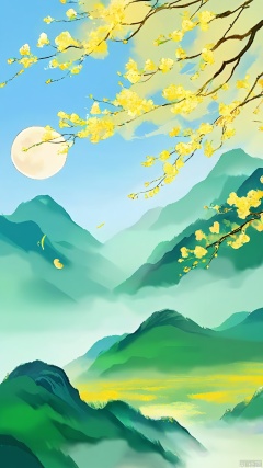 GFSS, A serene landscape painting featuring a full moon in the upper right corner, casting a soft glow over misty mountains in the background. The foreground is dominated by a tranquil, yellow-lit meadow with a small, traditional Chinese pavilion in the center. Two delicate trees with yellow blossoms frame the pavilion, adding to the peaceful atmosphere. The color palette is soft and calming, with shades of green, yellow, and gray. The style is reminiscent of traditional Chinese landscape art, with a focus on natural beauty and harmony.