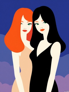BPYS, A stylized digital artwork featuring two women with vibrant, flowing hair. The woman on the left has fiery orange hair and wears a beige dress, while the woman on the right has black hair and wears a black dress. Both women have pale skin and green eyes, with their faces partially obscured by their hair. The background is a gradient of deep blue and purple hues. The style is modern and abstract, with bold, clean lines and a minimalistic aesthetic. The artwork has a smooth, polished texture.
