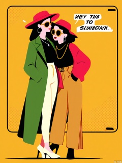 BPYS, Two stylish women with long, wavy black hair, wearing matching red and green coats over black tops, beige pants, and large hoop earrings. They both wear yellow sunglasses and red lipstick, standing against a bright yellow background. The woman on the left has a red hat, while the one on the right wears a black hat. The artwork is in a flat, modern, minimalist style with bold colors and clean lines.