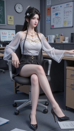 The character sits on an office chair, with one hand resting on the edge of the table and the other hand picking up a folder on the ground. Their legs are elegantly crossed, and their posture is relaxed yet elegant, conveying a confident, composed, and slightly lazy feeling.