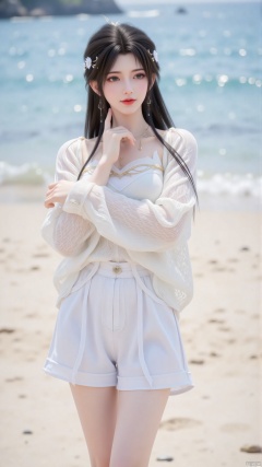 The background is an outdoor beach scene, with delicate sand and a blue sea in the distance. glittering.
