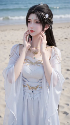 The background is an outdoor beach scene, with delicate sand and a blue sea in the distance. glittering.