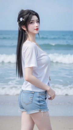 Wearing a white short sleeved T-shirt on the upper body, simple and basic style, the fabric fits the body curves, showing natural body lines; Pair your lower body with a pair of tight blue denim shorts, made of classic denim material.