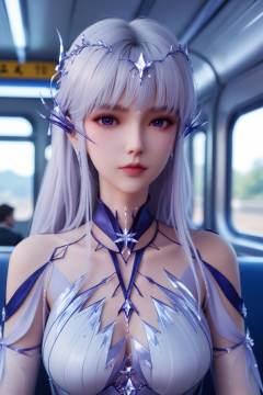 solo,1girl,fsolo focus,(perfect_anatomy:1.1),(upper_body:1.2),(portrait:1.1),sitting,(train_interior:1.1),(blurry_background:1.2),score_9,<lora:圣采儿-神降套装v5:0.65>,long silver hair adorned with intricate,crystal-like designs. Her attire is intricately designed,with a form-fitting white bodysuit,dress,