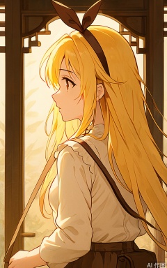 A serene portrait of YanQiaoke: a girl with long, vibrant yellow hair cascading down her back, adorned with a ribbon headband. She wears a crisp white shirt and flowsy brown skirt, carrying a shoulder bag in one hand. Her bright brown eyes gaze softly into the distance, framed by a warm, natural lighting that accentuates her gentle features.