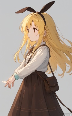 A serene portrait of YanQiaoke: a girl with long, vibrant yellow hair cascading down her back, adorned with a ribbon headband. She wears a crisp white shirt and flowsy brown skirt, carrying a shoulder bag in one hand. Her bright brown eyes gaze softly into the distance, framed by a warm, natural lighting that accentuates her gentle features.