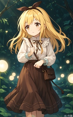 A serene portrait of YanQiaoke: a girl with long, vibrant yellow hair cascading down her back, adorned with a ribbon headband. She wears a crisp white shirt and flowsy brown skirt, carrying a shoulder bag in one hand. Her bright brown eyes gaze softly into the distance, framed by a warm, natural lighting that accentuates her gentle features.
