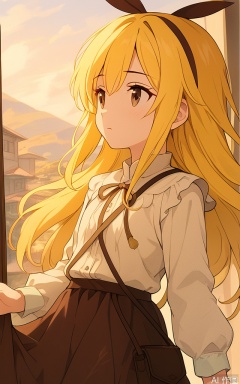 A serene portrait of YanQiaoke: a girl with long, vibrant yellow hair cascading down her back, adorned with a ribbon headband. She wears a crisp white shirt and flowsy brown skirt, carrying a shoulder bag in one hand. Her bright brown eyes gaze softly into the distance, framed by a warm, natural lighting that accentuates her gentle features.,score_8_up